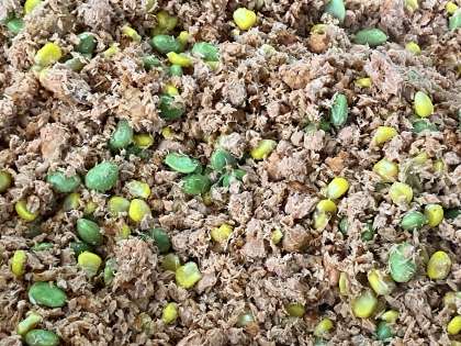 *さけのカラフルそぼろ⇒紅ざけフレークとコーン、むき枝豆を砂糖、塩、ワインビネガー、うすくちしょうゆを混ぜあわせ焼き物機で焼きました。