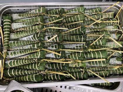 大阪市の給食では、こどもの日の行事献立に「ちまき」がつきます。ちまきは、米粉などで作ったもちを笹の葉につつみ、蒸して作る和菓子です。『こどもが元気に育ちますように』という願いがこめられています。給食のちまきは冷凍のものを焼き物機で蒸しています。
