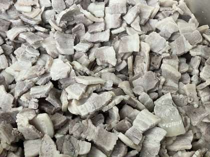 中国料理では、材料をゆでたあとに鍋にもどし、いためて仕上げることを「回鍋(ホイコウ)」といます。また、豚肉のことを「肉(ロー)」というので、「回鍋肉(ホイコウロー)」という名前がつきました。給食では、豚ばら肉をゆでてから、他の材料と一緒にいためています。
