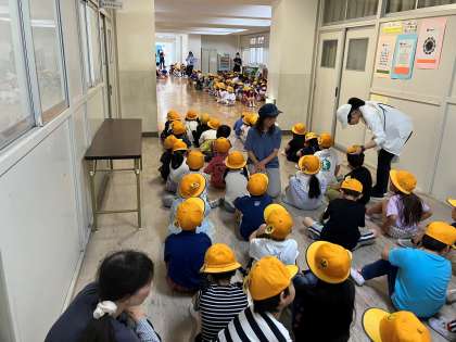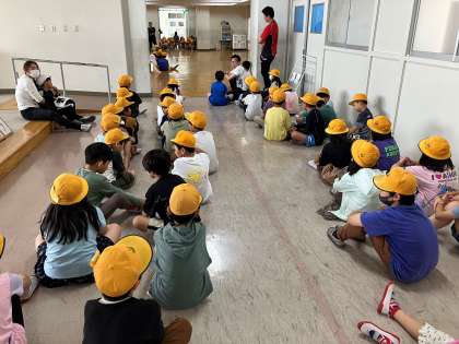 運動場に集まった後、津波情報の放送で今度は、3階の総合スペースや3階教室に避難しました。階段で3階まで移動したので約5分かかりましたが、静かに全校児童集まる事ができました。その後10時30分からは、地震や津波、台風などの自然災害を想定して保護者への引き渡し訓練がありました。
