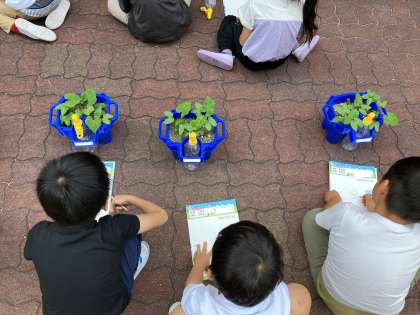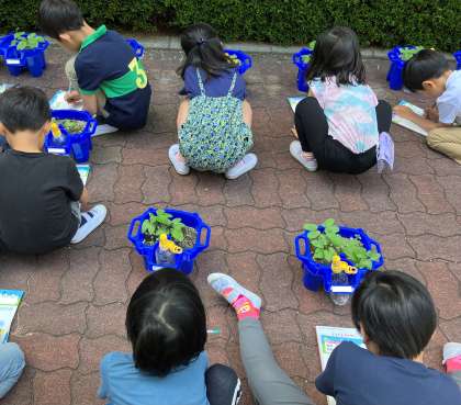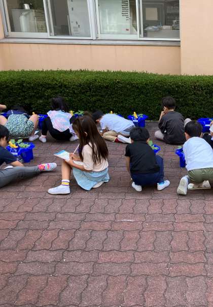生活科の時間、児童が日頃から一生懸命水やりしているあさがおの成長の様子を絵に書いています。