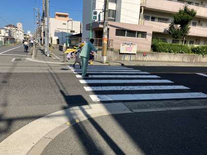また学校近くの交差点では、管理作業員の木田さんが黄旗を持って児童の安全を確保してくれています。いつもありがとうございます。