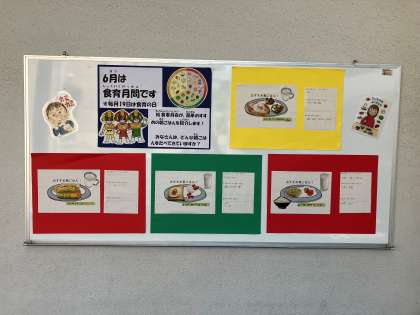 給食室前のホワイトボードに、給食委員会の6年生が考えたおすすめの「朝ごはん」が紹介されています。