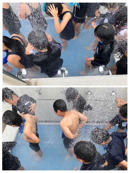 マリオのテーマ曲に合わせて顔を少しづつつけたり、ぐるりと回ったりと久しぶりのプールをとても楽しんでいました。