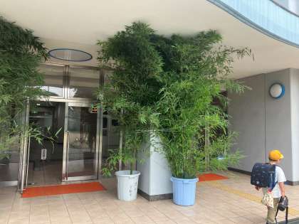 正門横の池には、鯉や亀が泳いでいます。毎朝、環境委員会の児童がえさをやりにきてくれています。また昨日の夕方から玄関前に七夕の笹が飾られています。どんな願い事が書かれるのか楽しみですね。