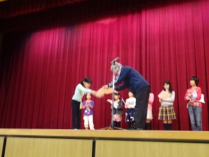 11月24日(火)児童朝会でPTA「親子で作ろう人権標語」の入選作の紹介と表彰を行いました。低学年の部と高学年の部、一人ずつ表彰状を渡しました。それぞれの作品は友だちのこと、人の気持ちを考えること、優しく接することなど、とてもよく考えられていました。