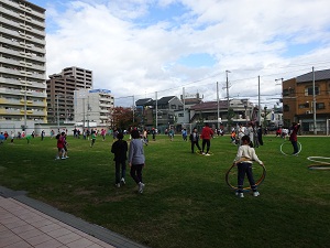 少し気温が下がった昼休み、大勢の子どもたちが運動場で遊んでいました。地面やジャンピングボードでのなわとび、フラフープを使っての遊びも目立ってきました。
