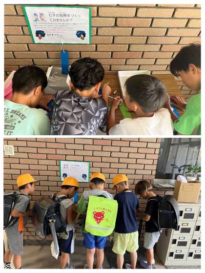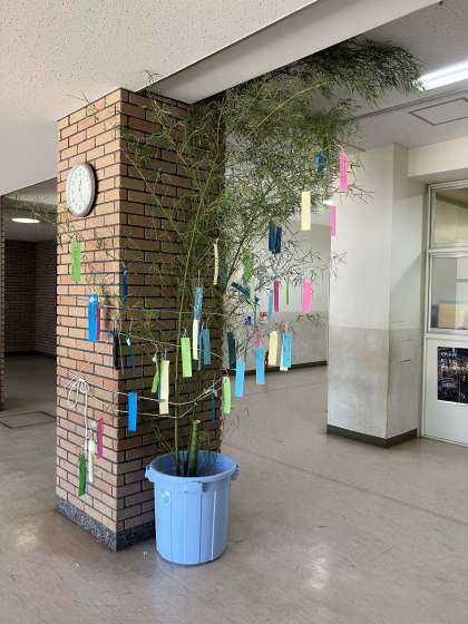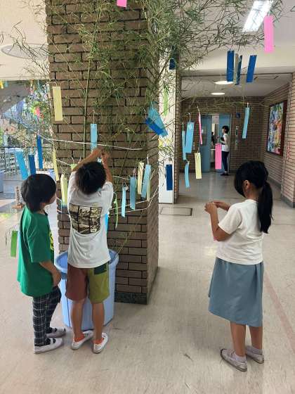 事務室前に、大きな笹と短冊がおいてあります。児童が次々に願い事を書いて笹にくくりつけていました。