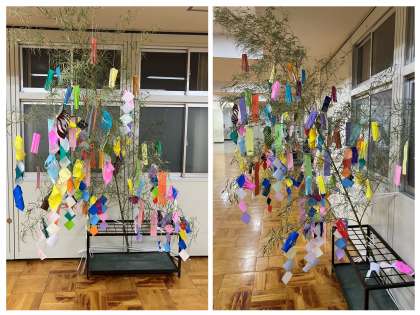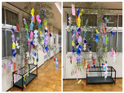 1年生教室前には、先日短冊にお願い事を書いた笹が飾ってあります。懇談会期間中飾っておきますので、お子様の短冊をぜひ見てください。【上→1年1組】【下→1年2組】