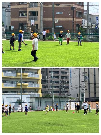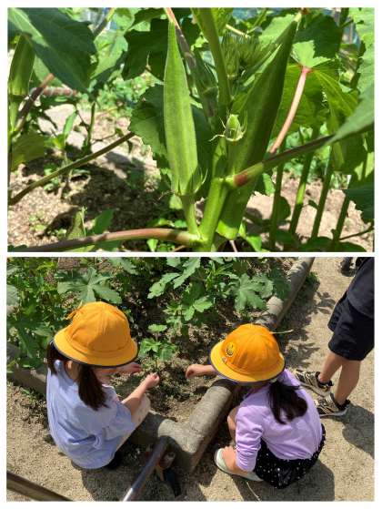 1学期最後の休み時間、元気いっぱい運動場で遊んでいました。また学習園で大きくなったオクラをみたり雑草を取っている児童もいました。