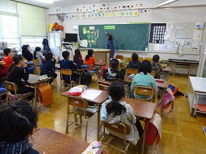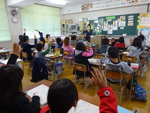 11月27日(金)今年度、1〜6年の全学級で他校より栄養教諭をお招きし、食育について栄養教室を行っています。今日は、4年生が栄養教室を行いました。野菜についての学習で、給食に出る野菜の種類や野菜摂取の必要性などを学びました。たくさんの掲示物が準備されていて、わかりやすい工夫がありました。