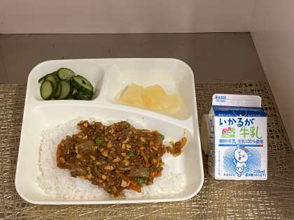 *今日のキーマカレーライスには、牛ひき肉、豚ひき肉の他に、ひきわり大豆と豚レバー(チップ)が入っていました。(写真下2枚)食べやすく味付けされた栄養たっぷりのおかずで、ほとんどのクラスで完食でした。