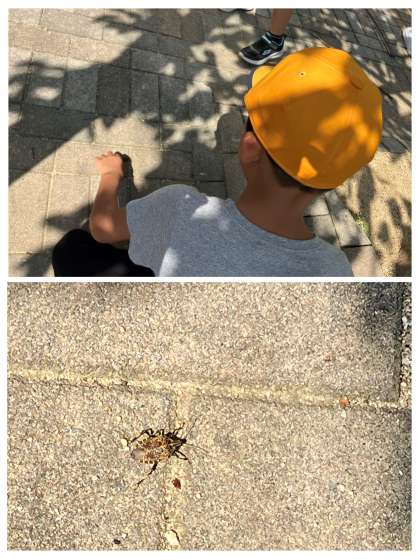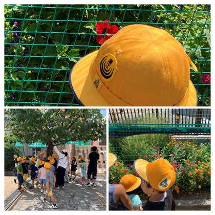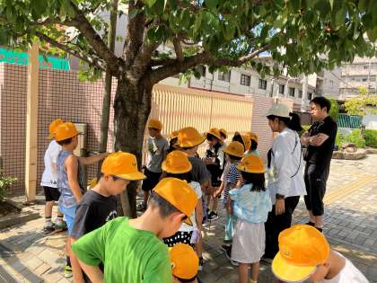 2時間目、1年2組が生活科の授業で「校庭探検」をしました。校門横の大きな木を観察したり、動いている虫を発見して、みんなで「なんの虫やろ?」と話していました。また、たくさんの花が咲いている場所では、児童が旅行に行ったときに咲いていた「ハイビスカス」の花もありました。