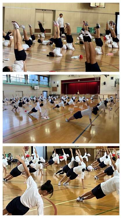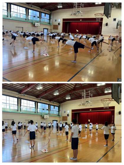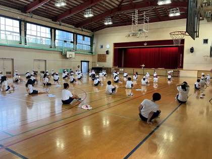 5時間目、体育館で6年生が運動会の団体演技の練習をしました。先生のお手本を見ながら上手にバランスを取っていました。小学校最後の運動会にむけて頑張って練習しています。