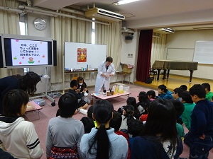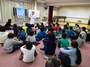 12月4日(金)学校薬剤師の先生をお招きして、6年生のお薬教室がありました。お薬の形状の種類やお薬の正しい飲み方などのお話を聞き、薬を飲むときの飲み物の種類について実験を交えた解説もありました。また、DVDで薬物乱用は体をむしばみ犯罪にもなることを学習しました。