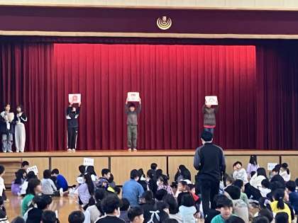 今日の朝会は、講堂で「アニメあてクイズ」をしました。司会のヒントを聞いて何のアニメかをあてるクイズです。ドラえもんや推しの子など児童に人気のアニメがたくさんでてきて答えが発表される度に盛り上がっていました。