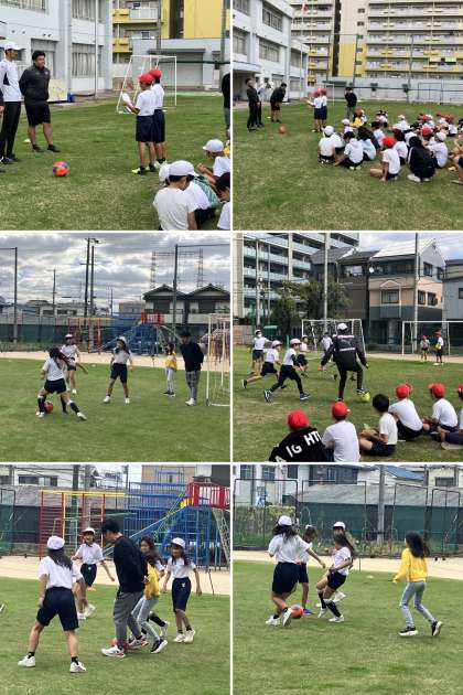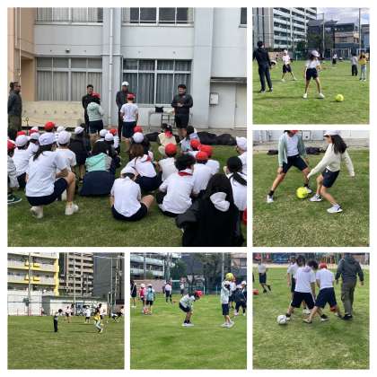 今日は、セレッソ大阪から3名のコーチが来られてサッカーを教えてくださいました。準備運動や基礎練習の後、コーチと試合をしました。コーチのボールを止めたり、ゴールをきめたりする児童もいて、とても盛り上がりました。みんなとても良い笑顔で参加でき、最後は代表児童がお礼の言葉を伝えました。セレッソ大阪の皆様、本日はありがとうございました。