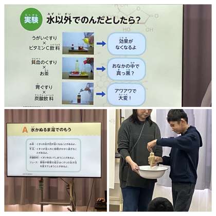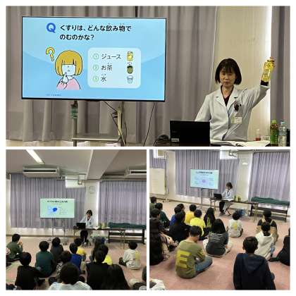 5時間目、薬剤師の辻本先生にお越しいただき「お薬教室」が行われました。薬について話しを聞いた後、「水以外でお薬を飲んだとしたら?」の実験をしました。保健委員会の児童に協力してもらい3つの飲料で飲み合わせをしました。ビタミンC飲料や炭酸飲料、お茶に薬を入れると色が変わったり、泡が溢れて「えーっ」「うわー」と口々に歓声をあげていました。とてもためになるお話しが聞けました。