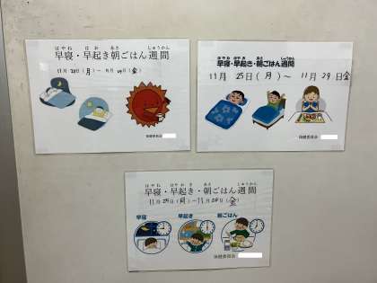 今日から29日まで、「早寝・早起き・朝ごはん週間」が始まりました。先週は保健委員会の児童が廊下や各クラスに掲示するポスターを持っていったり、今日からは放送で啓発を行ったりしています。この一週間は毎日児童がチェックカードをタブレットで入力しています。「早寝・早起き・朝ごはん」を習慣づけることで生活リズムを整えることができます。この機会にご家庭でも話し合ってみてはいかがでしょうか?