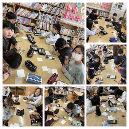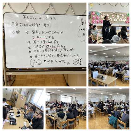 昨日の5.6時間目、はぐくみネットから地域の伊東さんが来られて「消しゴムはんこ作り」を行いました。各自考えた図案をトレーシングペーパーに書き、消しゴムに写してから三角刀で丁寧に掘ります。三角刀を使っている時は、みんな真剣な顔つきで集中していました。清江小学校では、毎年6年生が消しゴムはんこ作りをしています。小学校時代の思い出がまた一つ出来ました。