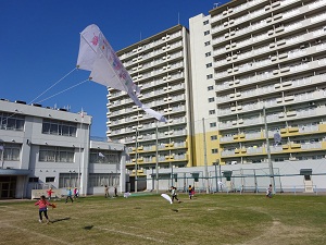 1月25日(月)1年生がたこあげをしました。たこには、自分で描いた絵がありました。寒い日ですが、元気に走ってたこをあげていました。風が出ると立ち止まってもあがっています。中には、友だちのたこ糸と絡まってしまうこともありました。たこがあがると、子どもの歓声もあがっていました。