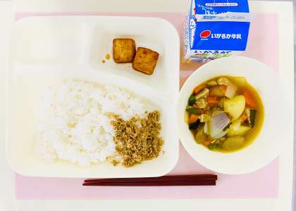 煮物には、ごぼう、にんじん、じゃがいも等、色々な野菜が使われています。どの具材も味を良く含んでいて、ごはんによく合う献立でした。