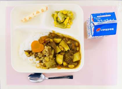 今日のカレーライスには大豆(ドライパック)が入っています。