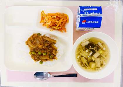 炒めたひき肉に、豚レバー(チップ)、玉ねぎを加えてさらに炒め、ケチャップやカレー粉、ウスターソース等を使用して味付けしています。ごはんが進む献立で、どの学年でも大好評でした。