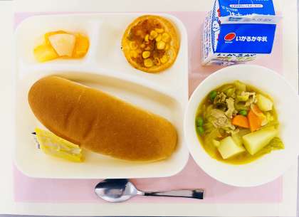 変わりピザには、原材料に乳を使用していないチーズを使用しています。1年生は「給食にピザが出るんや!」と、驚いていましたが、喜んで食べてくれていました。