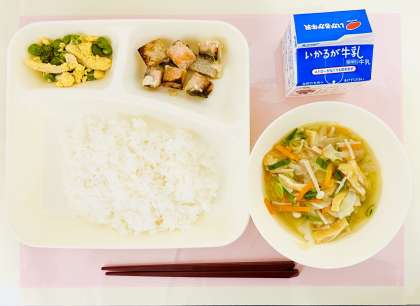 鮭の味噌焼きは、白みそ、薄口醬油等を使って下味をつけ、オーブンで蒸し焼きにしています。角切りの鮭は低学年にも食べやすく、ご飯によく合う味付けでご飯もすすんでいました。
