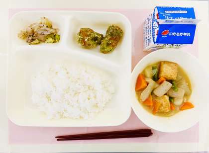 ちくわの磯部揚げは、青のりの風味が良く、どの学年でも大好評でした。