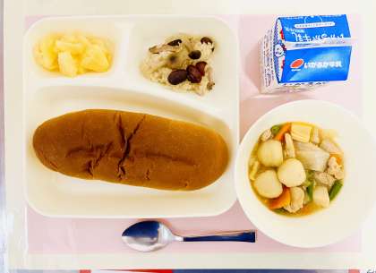 金時豆の中華おこわは、一クラス分ずつオーブンで蒸し焼きにして仕上げています。もちもちとした食感とごま油の風味が良く、特に高学年で大好評でした。