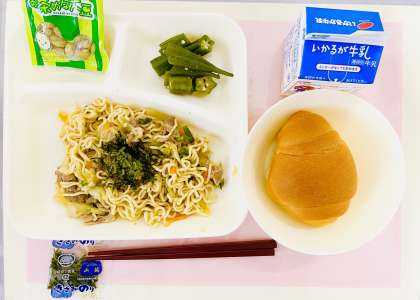 和風焼きそばは、薄口醤油、濃口醤油等で味付けしています。定番のソース味とは違った味付けでしたが、きざみのりの風味がアクセントになり、子どもたちには大好評でした。