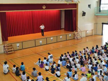 校長先生が日傘を使って、熱中症から自分の身を守る大切さをお話ししました。