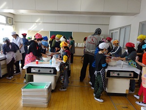 2月12日(金) 全学年が1回行うはぐくみの行事で、4年生がうどん作り体験をしました。講師にはうどん店の「杵屋」の方に来ていただきました。小麦粉を練るところから始め、平たく丸い形にしたら麺棒で伸ばしていきました。最後においしいだしでうどんをいただきました。「おかわりがほしいー」と声が上がっていました。教えていただいた杵屋の方、お手伝いいただいたはぐくみの地域・保護者の皆様、ありがとうございました。