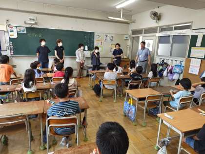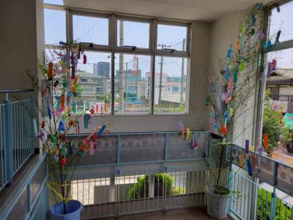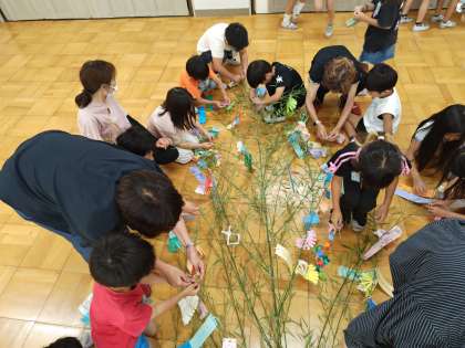 今日は地域の方をゲストティーチャーに迎え、七夕の飾り作りを教えてもらいました。その後、とって来て頂いた笹に短冊と一緒に飾り付けしました。みんなの願いが届くといいですね。