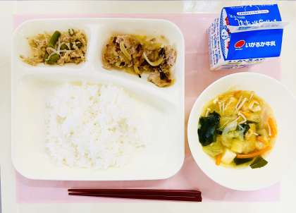 豚肉の生姜焼きは、しょうがのしぼり汁、濃口醤油、みりん等を使って味付けしています。ご飯によく合う献立で大好評でした。