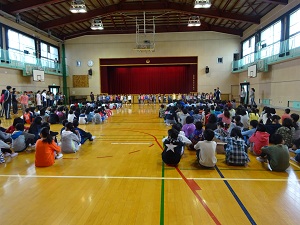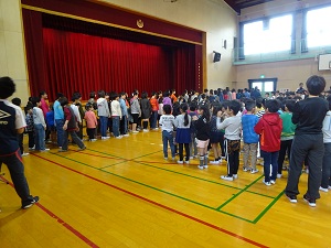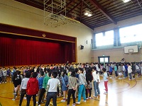 4月14日(木) 新1年生を2年生から6年生まで、みんなで迎えました。6年生が教室から講堂まで手をつないで引率してきました。2年生以上がお祝いの呼びかけをし、全学年で○×クイズや歌を歌いました。初めて、全学年がそろいました。