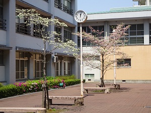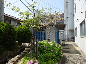 4月20日(水) 正門横の池のわきにあるハナミズキの花が咲いています。白の花と桃色の花がきれいに咲いています。その下では、ツツジも咲きだしています。中庭でもハナミズキが、白と桃色に咲いています。