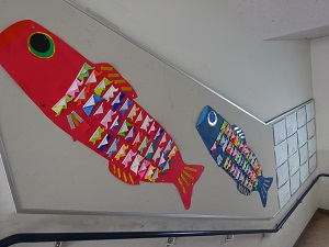 4月26日(火) 早いもので来週には5月になります。廊下・階段の掲示物に5月漂うものが出てきました。合わせて、子どもたちの書き方の作品が掲示されていました。
