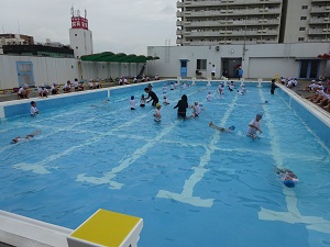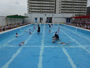 6月30日(木) 1年生2年生がプール水泳で着衣泳をしました。水難防止用に、服を着たまま水の中で動いたり泳いだりする体験をしました。また、水に落ちた時には、ペットボトルを使って浮くことができることも学習しました。