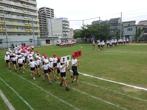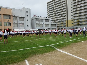 9月26日(月)全校で運動会の開会式・閉会式の練習を行いました。入場では、全学年が足並みをそろえて、しっかりと行進ができていました。プログラム1番「はじめの体操」も、列の前に立つ係の人に合わせ、ラジオ体操ができていました。