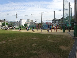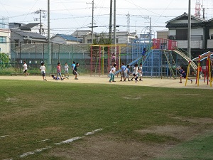 10月14日(金)5時間目と6時間目の休み時間、5年生を中心に運動場で遊んでいました。芝生部分は、水曜日のオーバーシードから養生に入りました。しばらく遊べません。運動場の端の部分で、上手に遊んでいます。