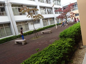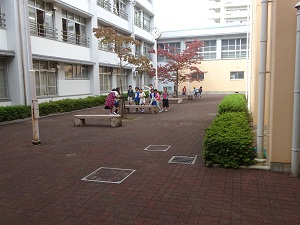 10月17日(月)雨上がりの昼休み、何人かの子どもたちが中庭で過ごしていました。中庭は、ブロックが敷き詰めてあるので、地面を気にせず上靴のまま出ることができます。何やら楽しそうにしていました。