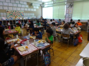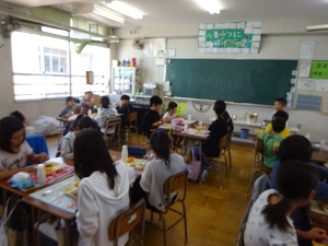 10月27日(木) 全学年で交流給食を行いました。6年と1年、5年と2年、4年と3年でペア学年を作り、学級ごとに10人が交代して、ペア学年が混じって給食を取りました。いつもと違う顔ぶれに、給食をよりおいしくいただきました。今日はハヤシライスでした。