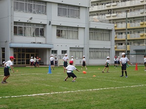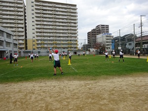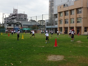 11月28日(月)冬の肌寒い気温の中、5年生が元気に体育の授業をしていました。ラグビー型の柔らかいボールを使ってのタグラグビーです。アメリカンフットボールに近いゲームです。ボールの変わったはずみ方に、歓声をあげてボールを追いかけていました。