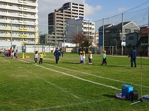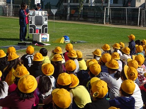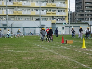 11月29日(火) 住之江警察署から指導者を招いて交通安全教室を低学年と高学年に分かれて実施しました。警察官のお話を聞いた後、低学年は安全な歩行、高学年は安全な自転車の通行を運動場で体験しました。道路を横断するときなど、車や周りの確認の大切さを学びました。