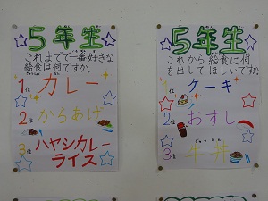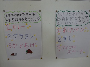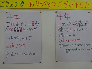 各学年の「好きな給食ランキング」と「出てほしい給食ランキング」の写真です。カレーはやっぱり人気です。面白いメニューも見られます。