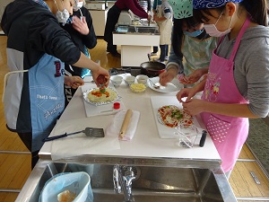 2月8日(水)6年生が調理実習でピザを作りました。生地をこねてのばすところから、その生地をフライパンで焼いて具をトッピング。オーブンで焼いて出来上がり。さすが6年生、チームワークと手際が良く、見事な出来栄えでした。思わずおかわりがほしくなるおいしさでした。