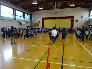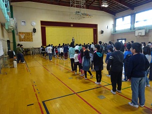 3月8日(水)朝の会の時間に、明日の「卒業を祝う会」に向けて1年生から5年生の練習がありました。たてわり班で集合し、6年生を迎える隊形・見送る隊形を確認した後、全員による呼びかけや歌の練習をしました。校舎の掲示板にも、卒業を祝う掲示がされています。